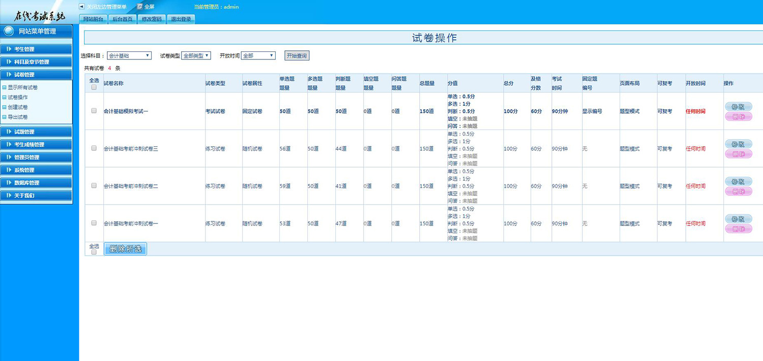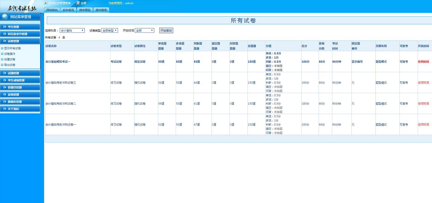 隨機(jī)組卷:此組卷方式在組卷時(shí)需要指定單選、多選及判斷時(shí)需要抽取的題數(shù),在考試時(shí)每個(gè)學(xué)生的試題內(nèi)容及順序不相同,但總題數(shù)是相同的,且都屬于同一科目。